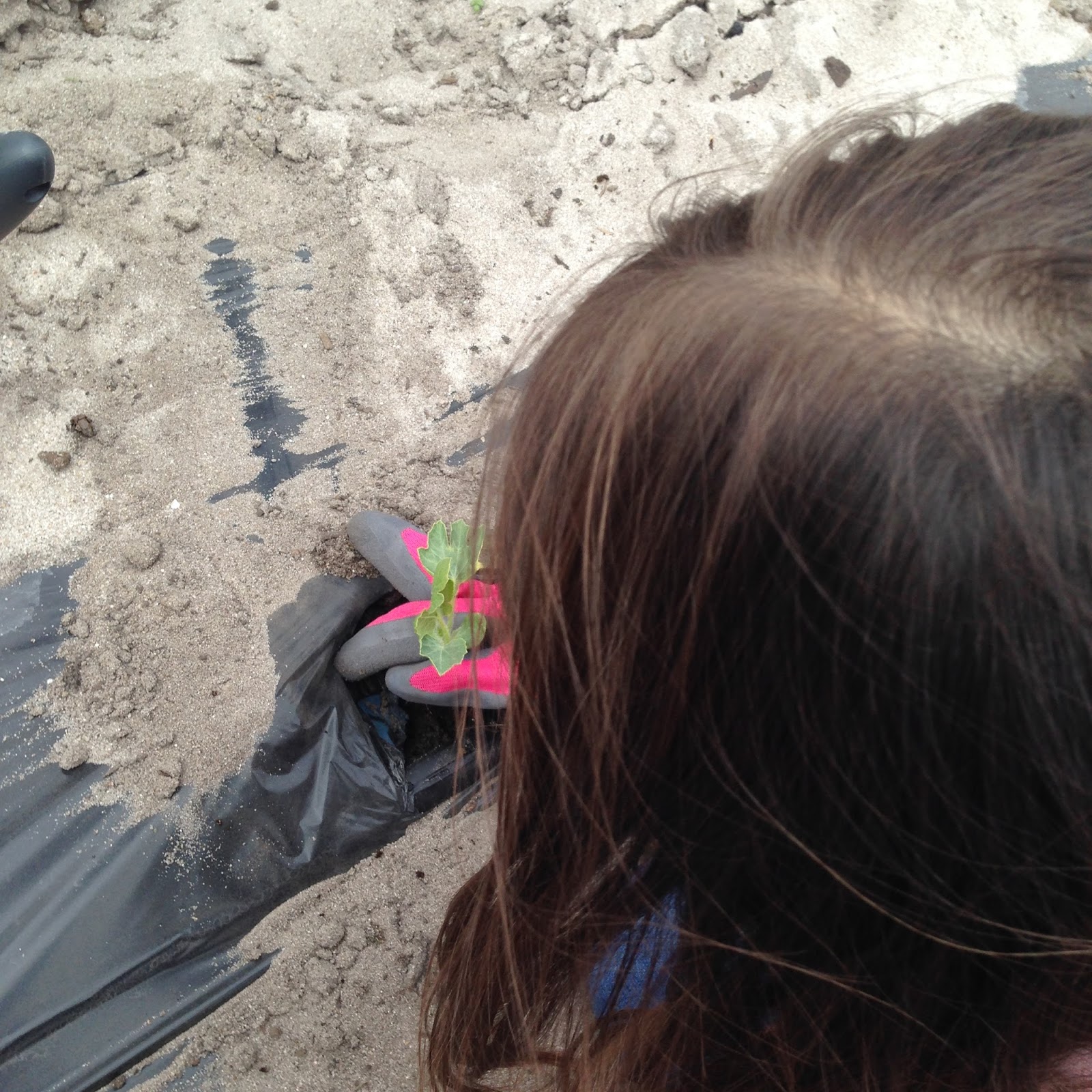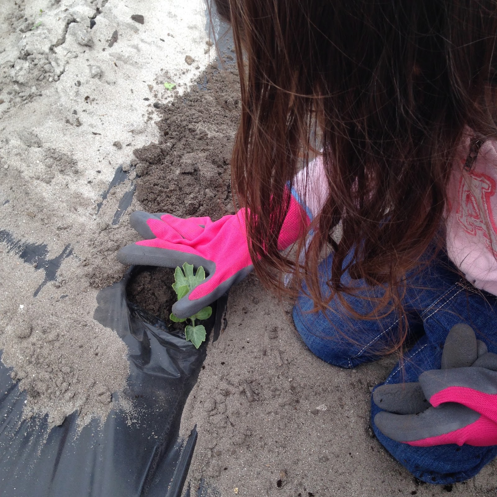 Assim que nos deram luz verde para deitarmos mãos à obra, correram os dois a agarrar uma planta de um dos tipos de melancia, e a escolher um local para a plantar!
