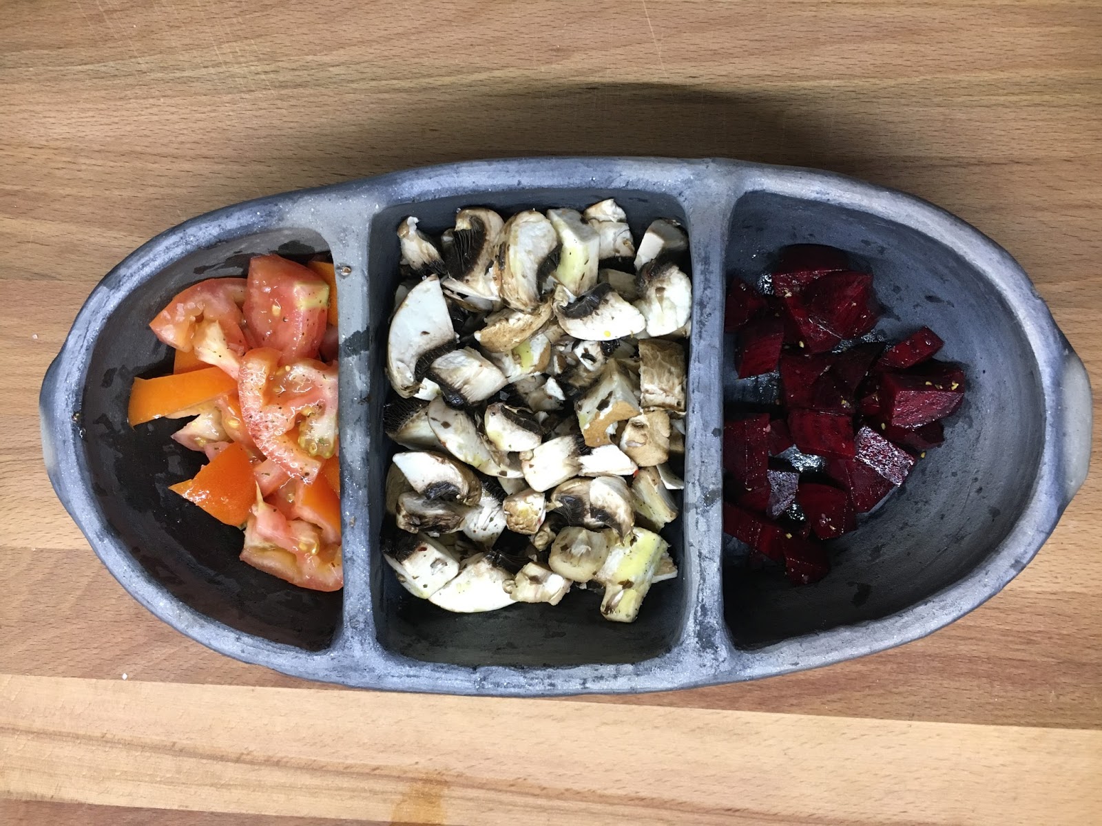 Para assar os vegetais usei uma assadeira de barro preto que tenho há anos que tem três divisórias. Na primeira, coloquei o tomate cortado em cubos, na segunda os cogumelos laminados e na terceira a beterraba descascada e cortada em cubos. Temperei com sal e oregãos, deitei um fio de azeite por cima e levei ao forno a 180ºC. Enquanto os vegetais assaram, preparei a alface e as laranjas e reservei. Em seguida fiz o molho de iogurte misturando 1 iogurte natural, umas gotas de sumo de limão, a mostarda, o cebolinho picado, sal, o caril em pó e um pouco de pimenta. Quando os vegetais ficaram cozinhados envolvi-os com os restantes ingredientes, guarneci com o molho de iogurte e voilá!