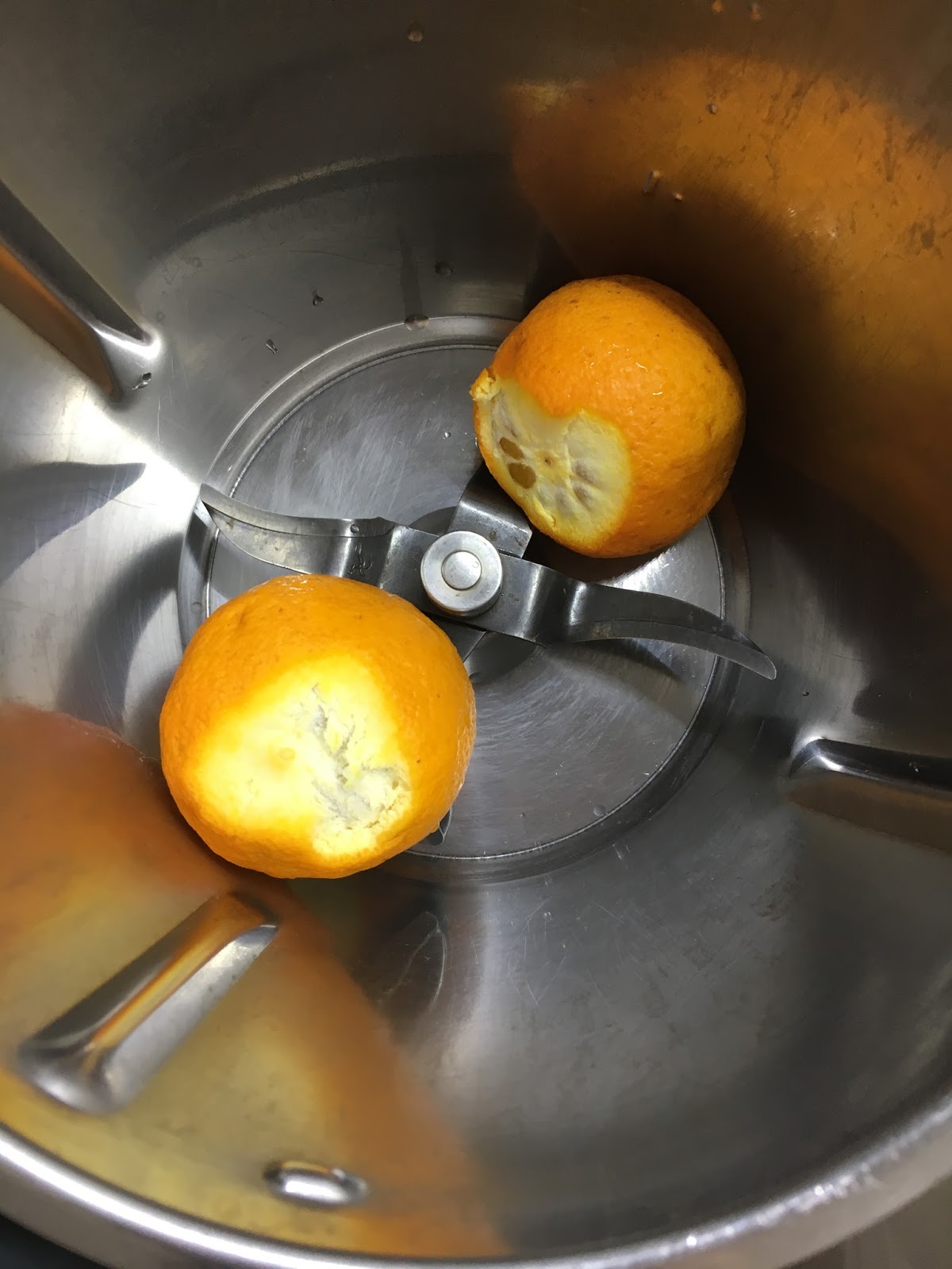 Espremer o sumo das 3 laranjas e reservar.Cortar os topos às restantes 2 laranjas e colocar no processador juntamente com o sumo reservado. [Bimby 1 min vel 9].