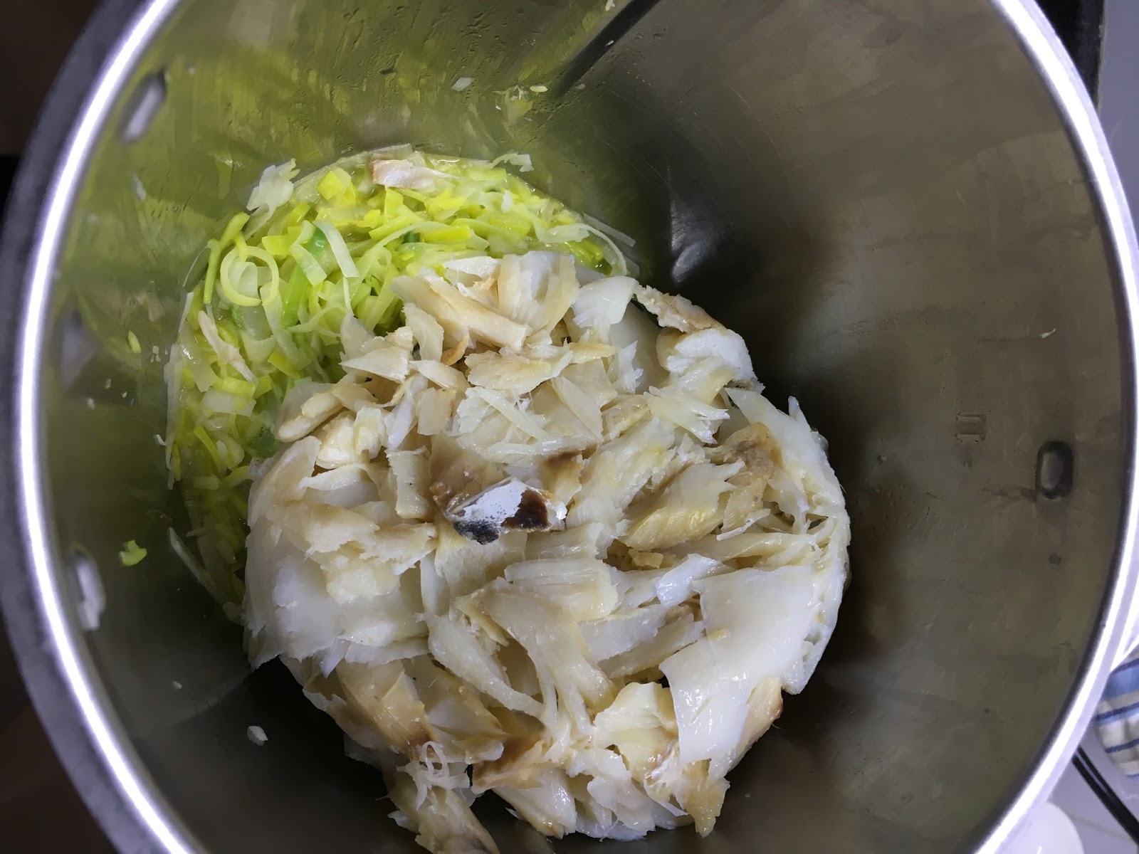 Separar as gemas das claras, reservar as gemas e bater as claras em castelo. Reservar. Laminar o alho francês e saltear na margarina [Na bimby 6 minutos, 90.ºC, velocidade 3 colher inversa]. Depois de salteado o alho francês, juntar o bacalhau, previamente cozido, limpo e desfiado. Refogar mais 5 minutos [5 minutos, 90.ºC, velocidade 1 colher inversa]. Juntar o leite, a farinha e as gemas e misturar bem [6 minutos, 90.ºC, velocidade 4 colher inversa]. Deitar o preparado num recipiente de forno, envolver com as claras e levar ao forno a 180.ºC até dourar.