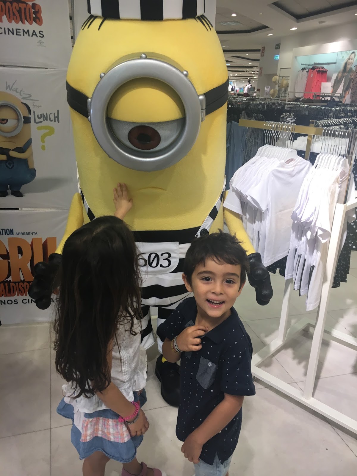 Foi nesse âmbito que fomos convidados a visitar a loja do Colombo, para conhecer as peças da colecção e os próprios Minimos! Não imaginam a excitação do Daniel e da Carolina quando viram dois mínimos em tamanho real a caminhar por entre os cabides da loja gritando "Bananaaaaaaaaaa"!
