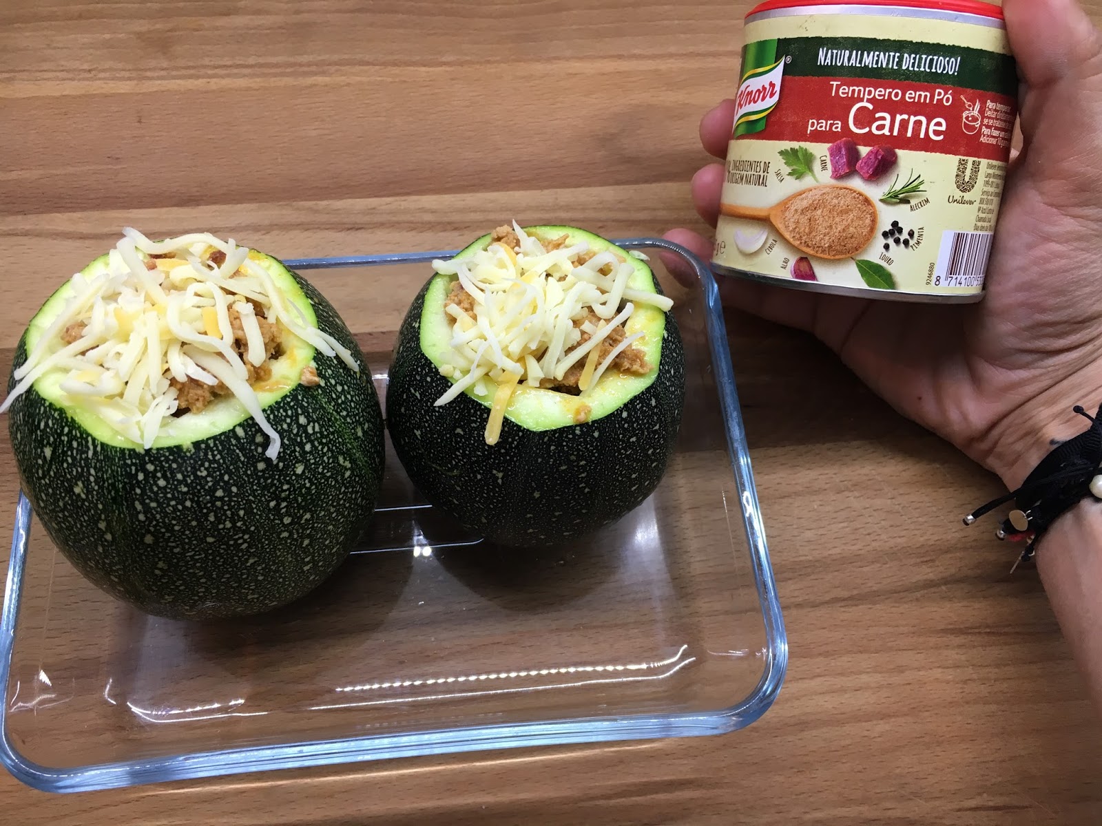 Temperar o bife de peru com knorr para carnes, e alourar ligeiramente num fio de azeite em lume médio. Colocar no interior das courgettes, espalhar uma porção de queijo ralado por cima e levar ao forno a gratinar a 180ºC até o queijo ficar tostado.